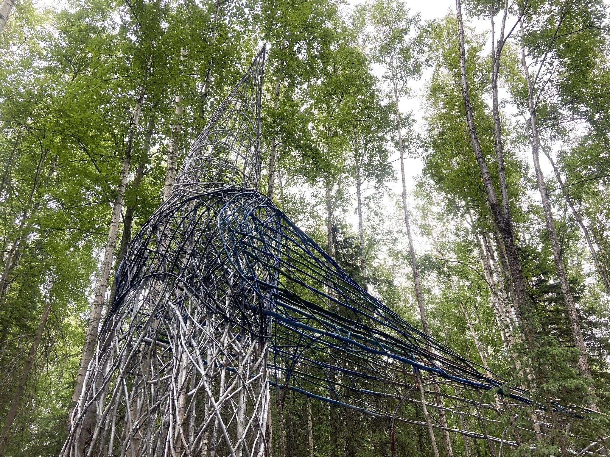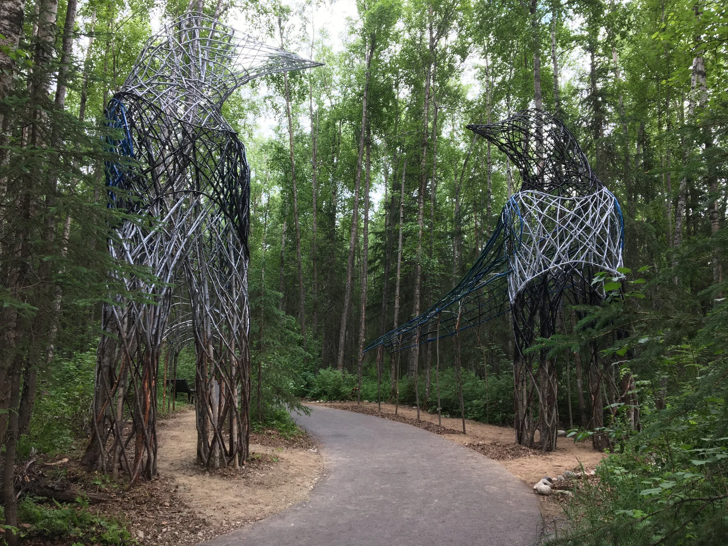 Every Alaskan knows about the long winter nights and short winter days that become the long summer days and short summer nights. Built during the summer solstice at the Alaska Botanical Garden, this pair of avian avatars will remain on view through the winter solstice. Sited facing one another across the walking path, they act as a gateway as guests explore the gardens. Night and Day celebrate the changing light that defines the experience of living in this unique climate using the magpie, an iconic Alaskan bird to convey this message. One is white, symbolizing the day or light, and one is black, symbolizing the night or darkness. Together they tell the story of the unique ecology of the Alaskan environment.