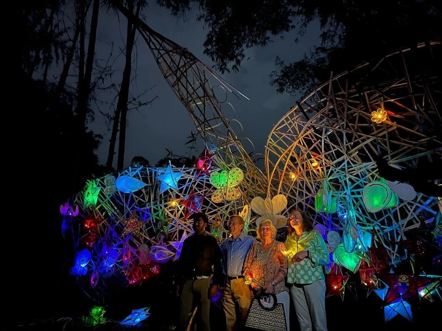 Held in Binh Duong province, on the grounds of Phu An Bamboo Village, approximately 125 people from over 20 countries gathered together to experience the wonders of bamboo and learn from global experts on various aspects of this versatile natural resource. The most spontaneous build came as a result of the creative sculptors, The Myth Makers, Andy Moerlein & Donna Dodson (USA). We designed a representation of the legendary bird of Vietnamese mythology, the Chim Lac! This creation was adorned with festive lights in honor of World Bamboo Day, as we marched alongside the Mid-Autumn Festival with children galore! Singing and shouting of "BAMBOO" echoed through the bamboo groves; it was magical. See the video produced by Bryan McCLelland.